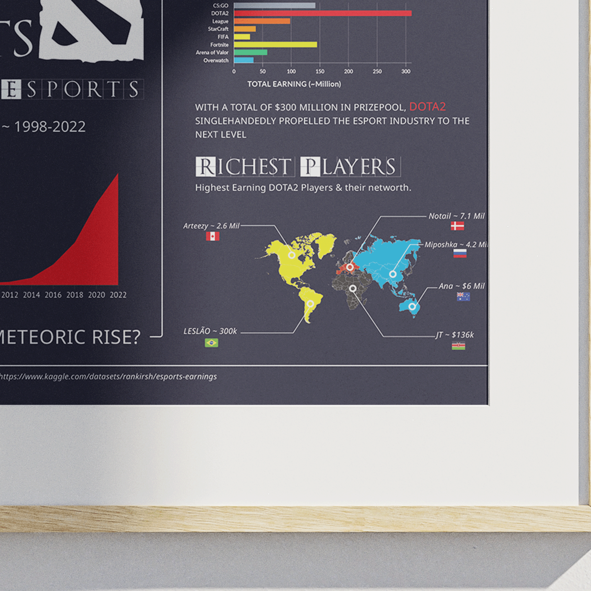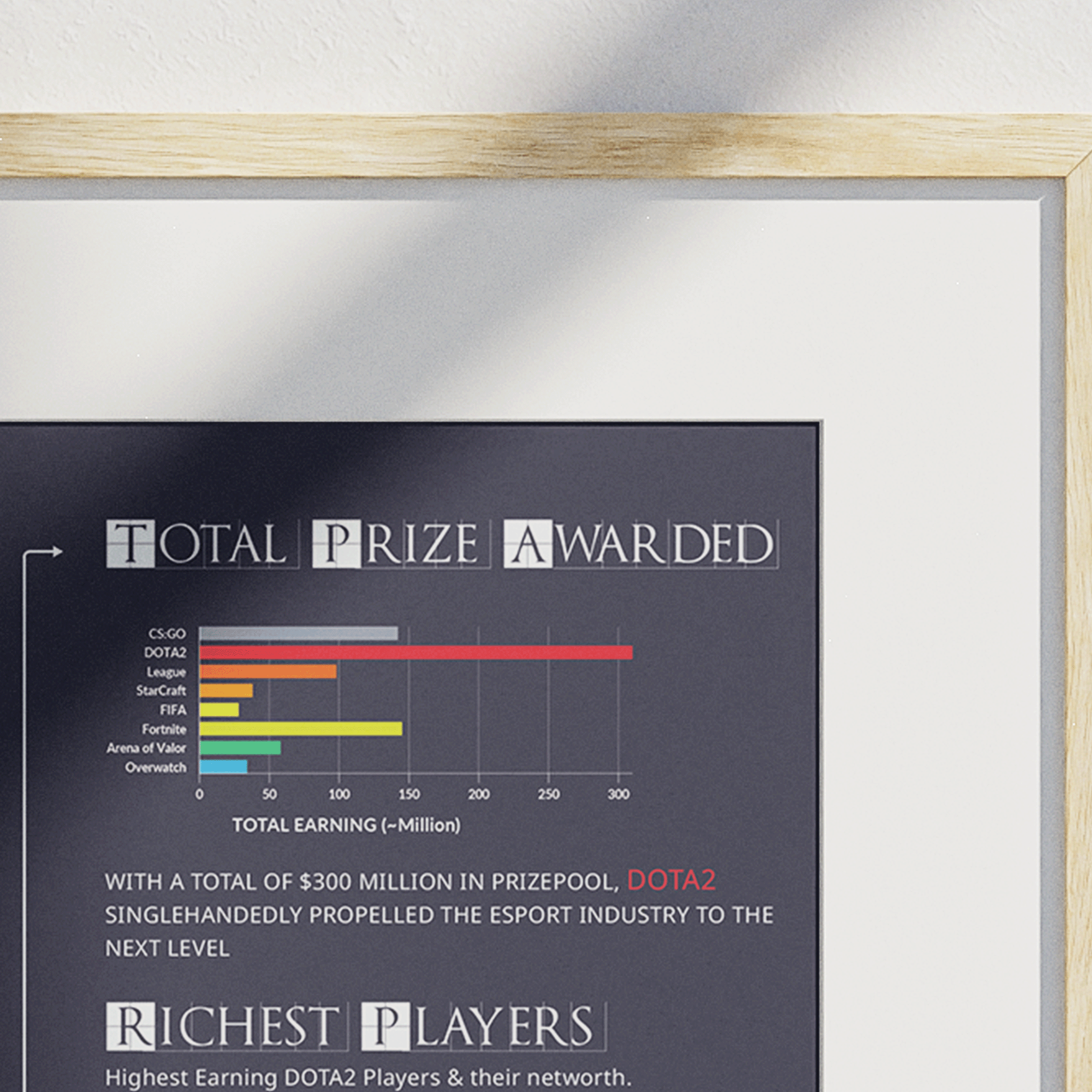 Once I had all my data and the framework of my narrative ready, I moved to the second phase of this project: Data Visualization. It was a blast using Trajan as I always loved this typeface but could never find an opportunity to use. Lucky for me Dota2's official typeface was Trajan. I created all the graphs and statistical representation and finally compiled them all in a constricted but digestible fashion. All the stats and data is factual and accurate.